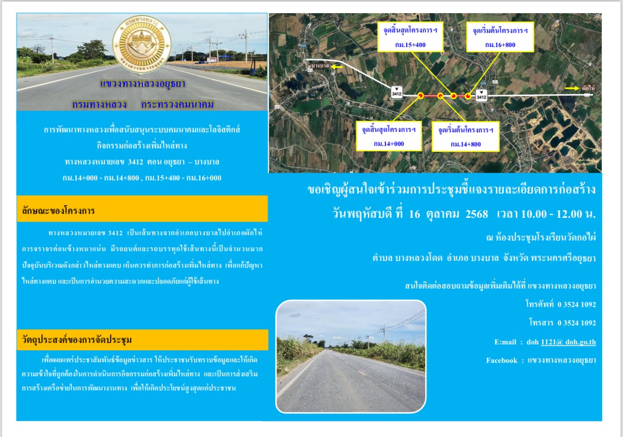 โครงการก่อสร้างโครงข่ายทางหลวงแผ่นดิน กิจกรรมก่อสร้างทางหลวงพัฒนาพื้นที่ระดับภาค งานก่อสร้างเพิ่มมาตรฐานทางหลวงระดับภาค ทางหลวงหมายเลข 3412 ตอน อยุธยา - บางบาล กม.16+000 - กม.18+000
