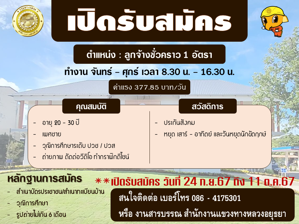 สนใจติดต่อได้ที่ งานสารบรรณ สำนักงานแขวงทางหลวงอยุธยา หรือโทร 086-4175301