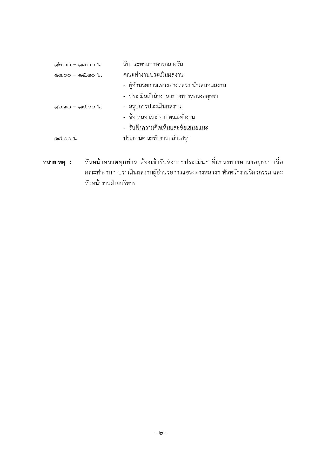 วันพุธที่ 19 มิถุนายน 2562 นายพรพรต สุริยนต์ รองผู้อำนวยการสำนักงานทางหลวงที่ 13 ตำแหน่งที่ 1 (ประธาน) และคณะทำงานฯ ตรวจติดตามและประเมินผลงานการปฏิบัติและการบริหารงานของฝ่ายปฏิบัติการ แขวงทางหลวงอยุธยา ตลอดจนหน่วยงานในสังกัด ให้มีประสิทธิผลเป็นไปตามหลักวิชาการ สอดคล้องกับนโยบายของกรมทางหลวง เกิดผลสัมฤทธิ์ในการพัฒนาการบริหารงานโดยรวม เพื่อประกอบการพิจารณาในการดำเนินการคัดเลือกผู้อำนวยการแขวงทางหลวง หัวหน้าหมวดทางหลวง และหัวหน้างานฝ่ายวิศวกรรม ในระดับสำนักงานทางหลวง เสนอคณะอนุกรรมการประเมินผลงานบำรุงทาง งานอำนวยความปลอดภัย ประจำภาค ปี 2562 เพื่อพิจารณาประเมินผลงานดีเด่นต่อไป โดยมี นายทรงยศินทร์ ชนปทาธิป ผู้อำนวยการแขวงทางหลวงอยุธยา พร้อมเจ้าหน้าที่ในสังกัด และผู้ที่เกี่ยวข้องให้การต้อนรับ และฝ่ายปฏิบัติการนำเสนอผลงานต่อคณะทำงานฯ ณ ห้องประชุมแขวงทางหลวงอยุธยา