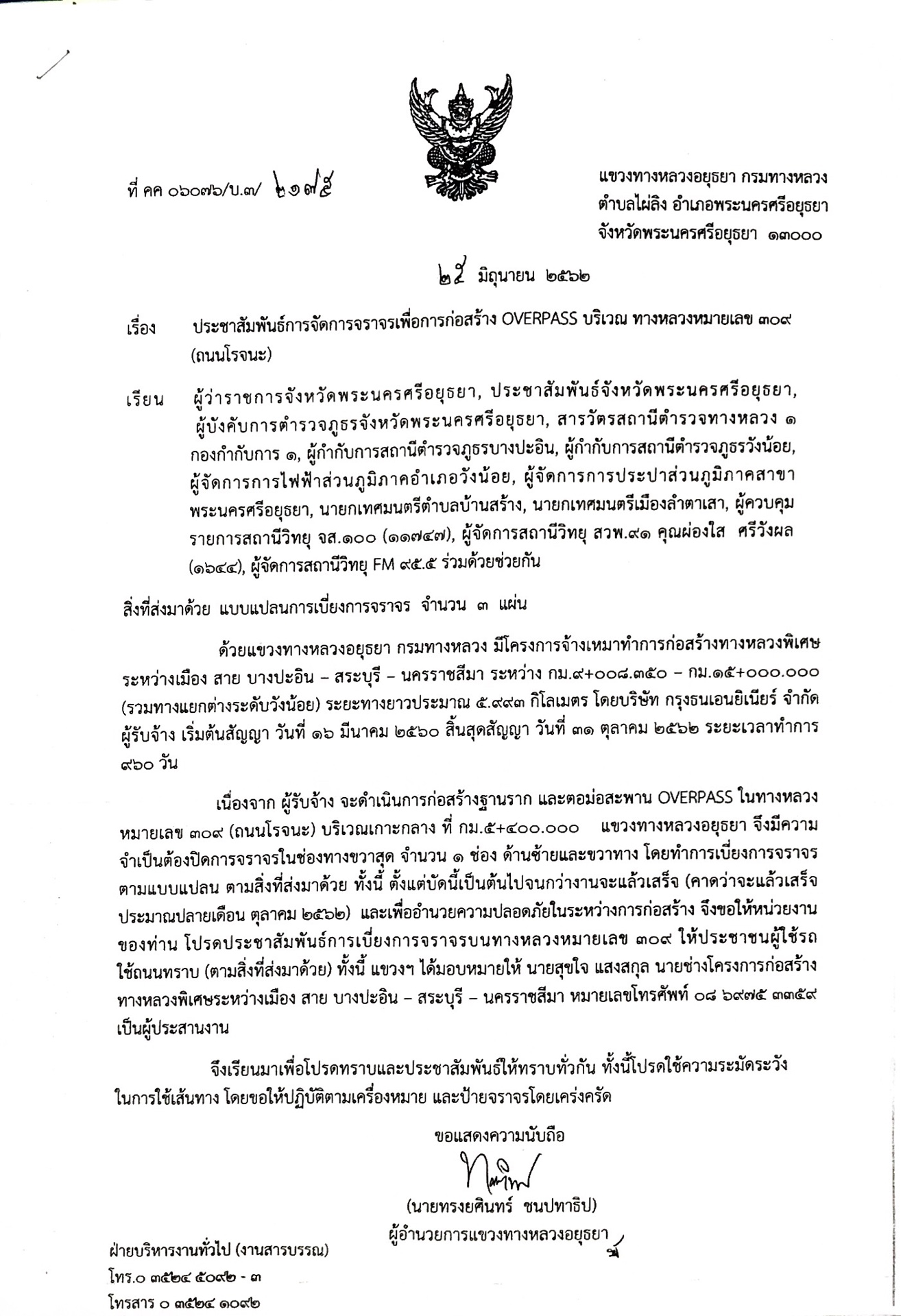 ด้วยแขวงทางหลวงอยุธยา กรมทางหลวง มีโครงการจ้างเหมาทำการก่อสร้างทางหลวงพิเศษ ระหว่างเมือง สาย บางปะอิน – สระบุรี – นครราชสีมา ระหว่าง กม.9+008.350 – กม.15+000.000 (รวมทางแยกต่างระดับวังน้อย) ระยะทางยาวประมาณ 5.993 กิโลเมตร โดยบริษัท กรุงธนเอนยิเนียร์ จำกัด ผู้รับจ้าง เริ่มต้นสัญญา วันที่ 16 มีนาคม 2560 สิ้นสุดสัญญา วันที่ 31 ตุลาคม 2562 ระยะเวลาทำการ 960 วัน เนื่องจาก ผู้รับจ้าง จะดำเนินการก่อสร้างฐานราก และตอม่อสะพาน OVERPASS ในทางหลวงหมายเลข 309 (ถนนโรจนะ) บริเวณเกาะกลาง ที่ กม.5+400.000 แขวงทางหลวงอยุธยา จึงมีความจำเป็นต้องปิดการจราจรในช่องทางขวาสุด จำนวน 1 ช่อง ด้านซ้ายและขวาทาง โดยทำการเบี่ยงการจราจร ตามแบบแปลน ตามสิ่งที่ส่งมาด้วย ทั้งนี้ ตั้งแต่บัดนี้เป็นต้นไปจนกว่างานจะแล้วเสร็จ และเพื่ออำนวยความปลอดภัยในระหว่างการก่อสร้าง ขอประชาสัมพันธ์การเบี่ยงการจราจรบนทางหลวงหมายเลข 309 ให้ประชาชนผู้ใช้รถ ใช้ถนนทราบ ทั้งนี้ แขวงฯ ได้มอบหมายให้ นายสุขใจ แสงสกุล นายช่างโครงการก่อสร้างทางหลวงพิเศษระหว่างเมือง สาย บางปะอิน – สระบุรี – นครราชสีมา หมายเลขโทรศัพท์ 08 6975 3359 เป็นผู้ประสานงาน