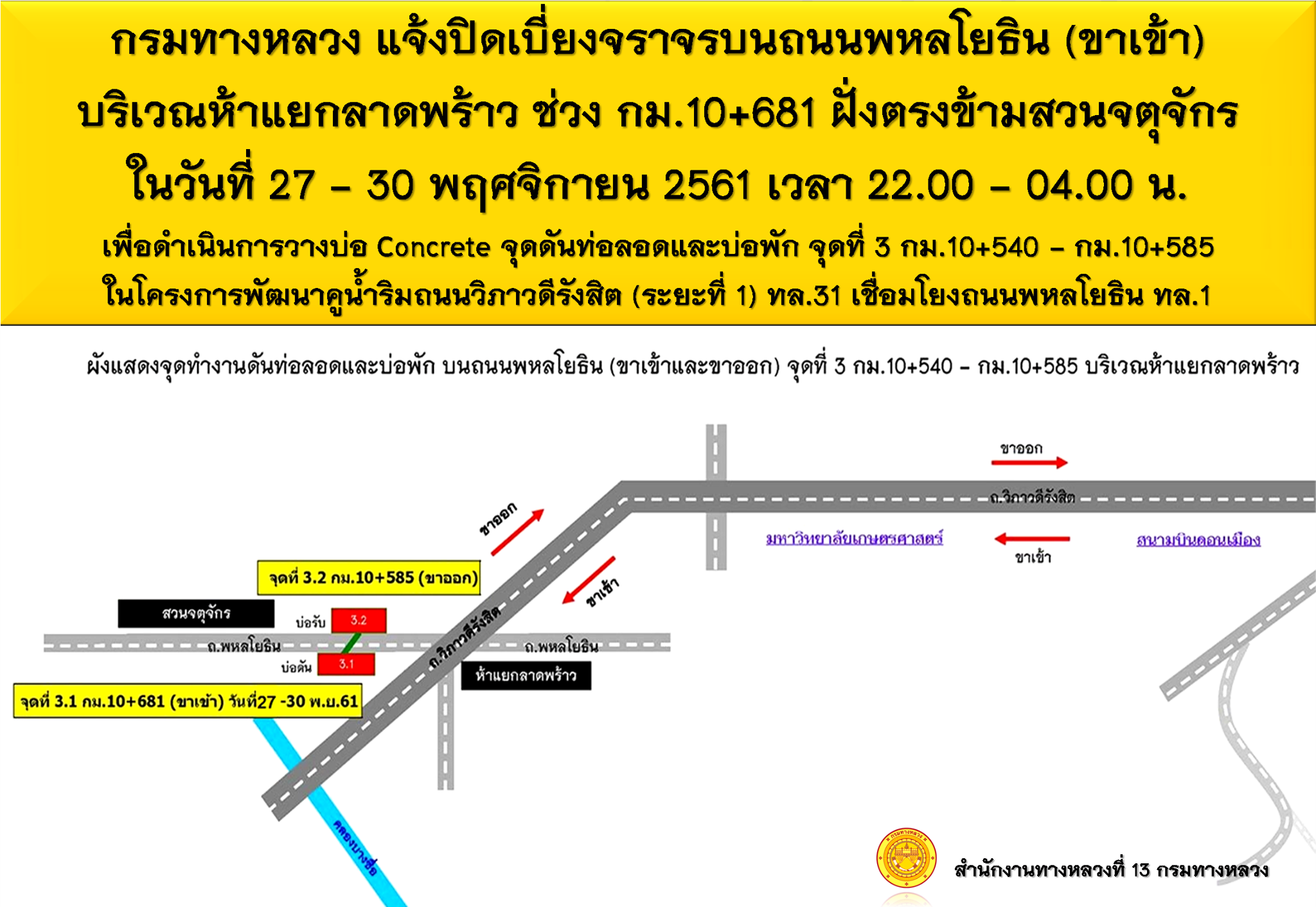 แจ้งปิดการจราจรบนทางหลวงหมายเลข 31 (ถนนวิภาวดีรังสิต)