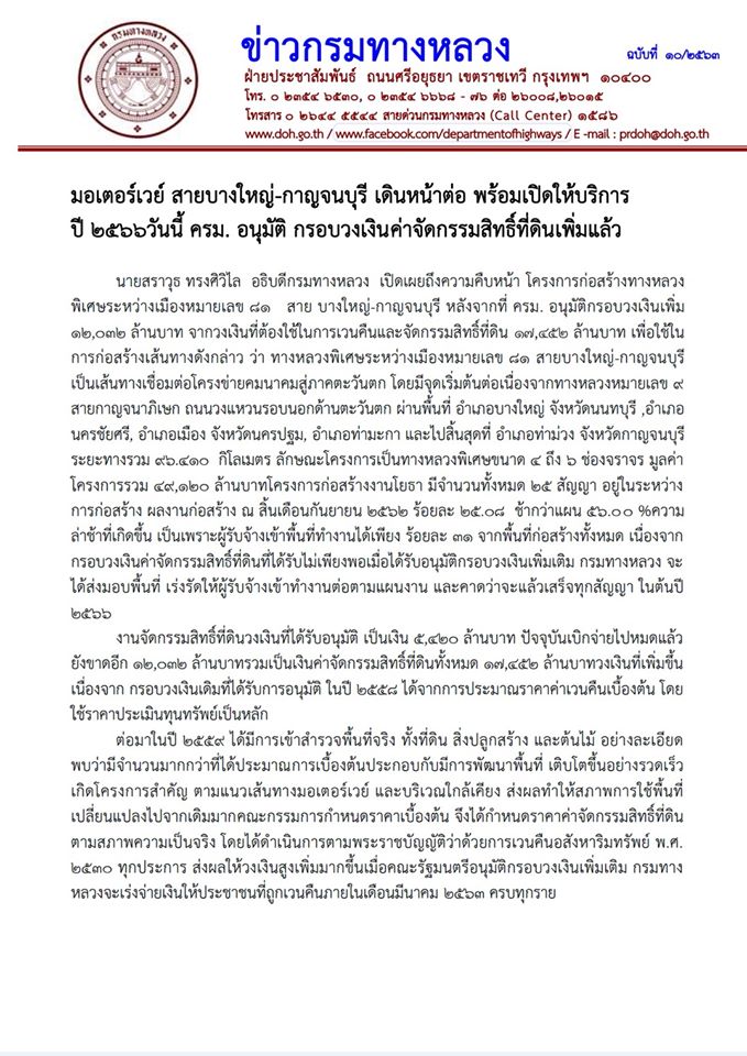 ข่าวประชาสัมพันธ์กรมทางหลวง มอเตอร์เวย์ สายบางใหญ่-กาญจนบุรี เดินหน้าต่อ พร้อมเปิดให้บริการปี 2566 วันนี้ ครม. อนุมัติ กรอบวงเงินค่าจัดกรรมสิทธิ์ที่ดินเพิ่มแล้ว