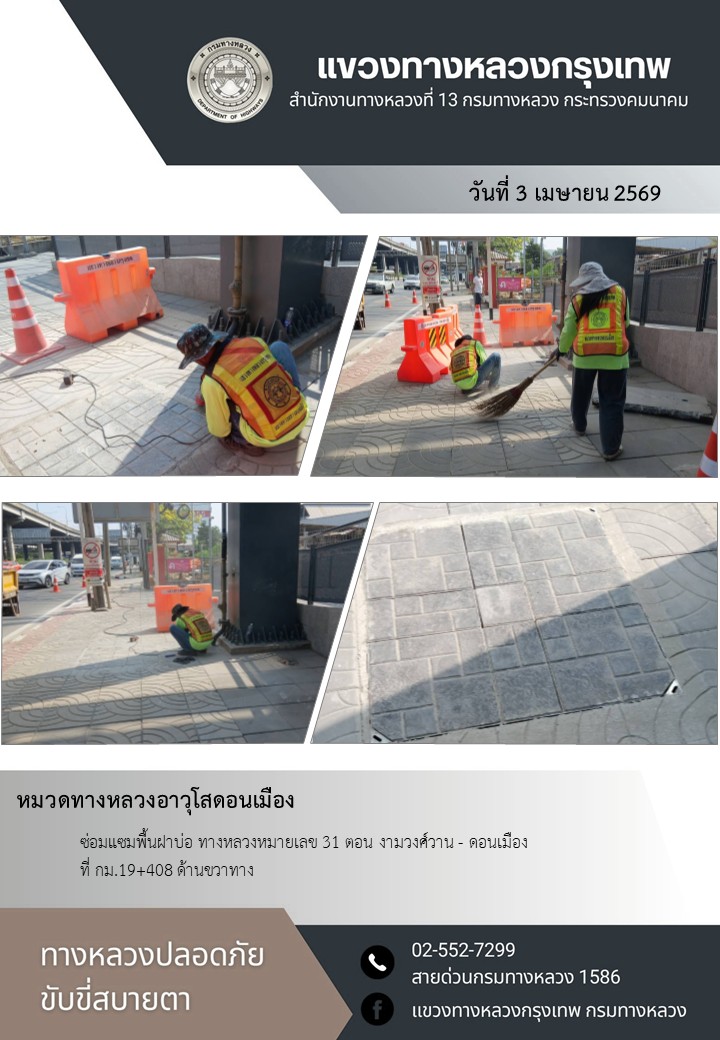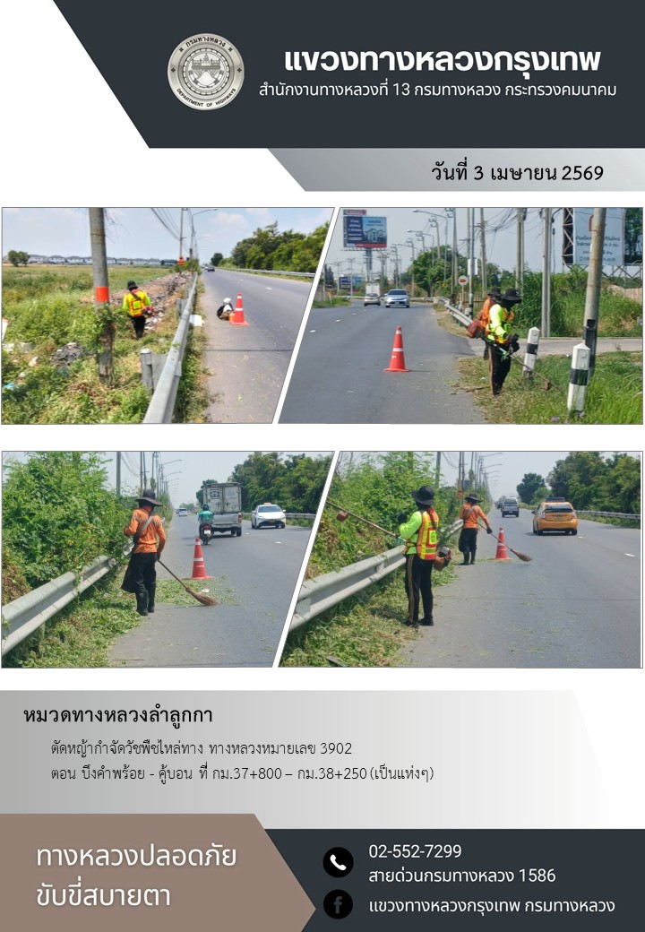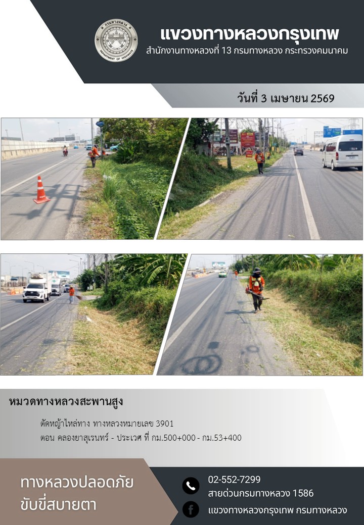 "ทางหลวงปลอดภัย ขับขี่สบายตา แขวงทางหลวงกรุงเทพ" ประจำวันที่ 3 เมษายน 2569