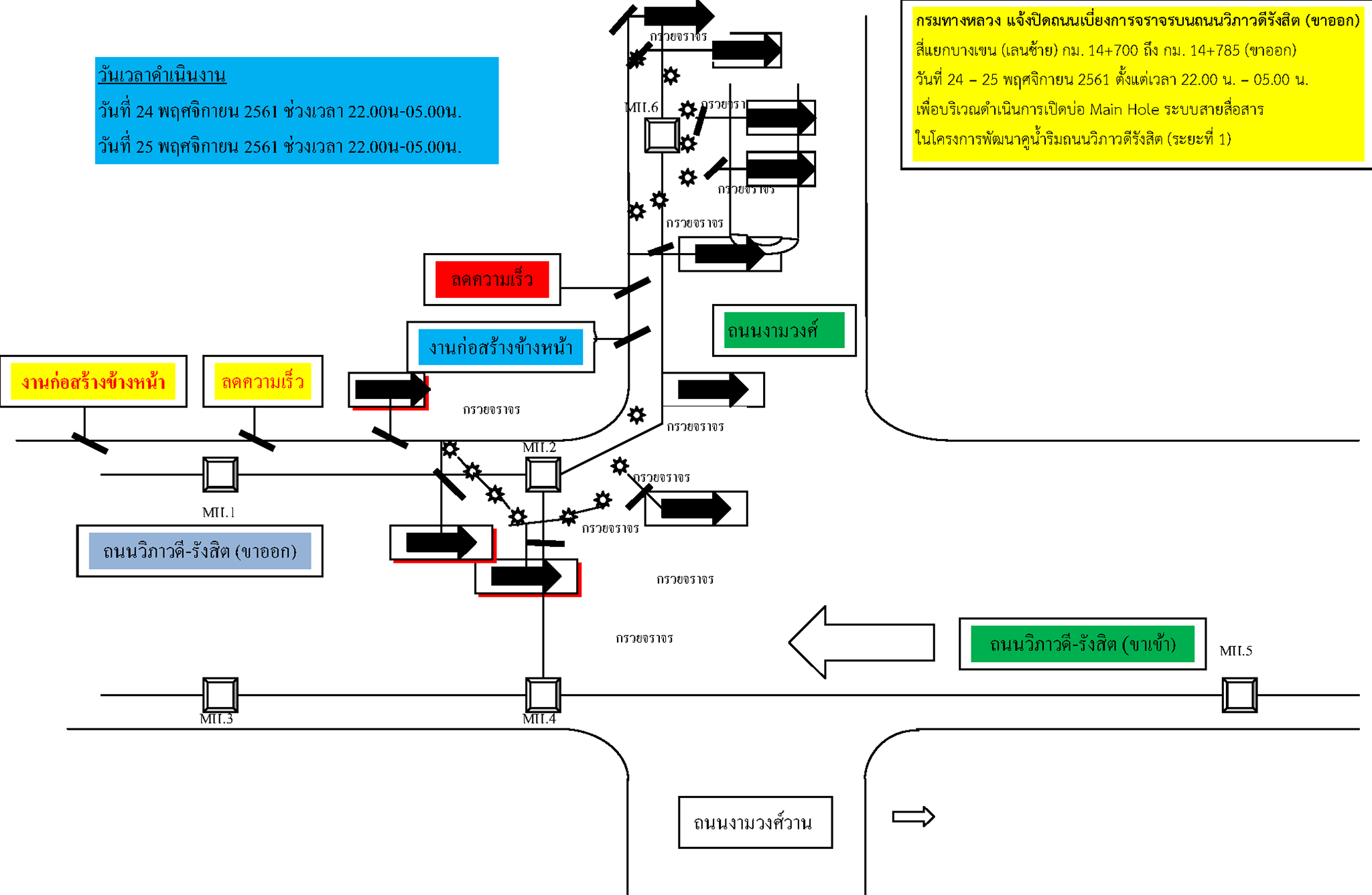 กรมทางหลวง โดย สำนักงานทางหลวงที่ 13 แจ้งปิดเบี่ยงจราจรบนถนนวิภาวดีรังสิต (ขาออก) บริเวณแยกบางเขน ระหว่าง กม.14+700 – กม.14+785 ช่องเลนซ้าย ในวันที่ 24 – 25 พฤศจิกายน 2561 เวลา 22.00 - 05.00 น. เนื่องจาก CAT จะเข้าสำรวจพื้นที่และดำเนินการรื้อย้ายแนวสายสื่อสารที่กีดขวางงานขุดวางท่อเหลี่ยม ในโครงการพัฒนาคูน้ำริมถนนวิภาวดีรังสิต (ระยะที่ 1) ทล.31 เชื่อมโยงถนนพหลโยธิน ทล.1 จึงมีความจำเป็นต้องปิดและเบี่ยงจราจรชั่วคราวในจุดดังกล่าว ระหว่างดำเนินการอาจทำให้การจราจรติดขัด ไม่สะดวกแก่ผู้ใช้รถใช้ถนนและประชาชนทั่วไป กรมทางหลวงต้องขออภัยมา ณ โอกาสนี้