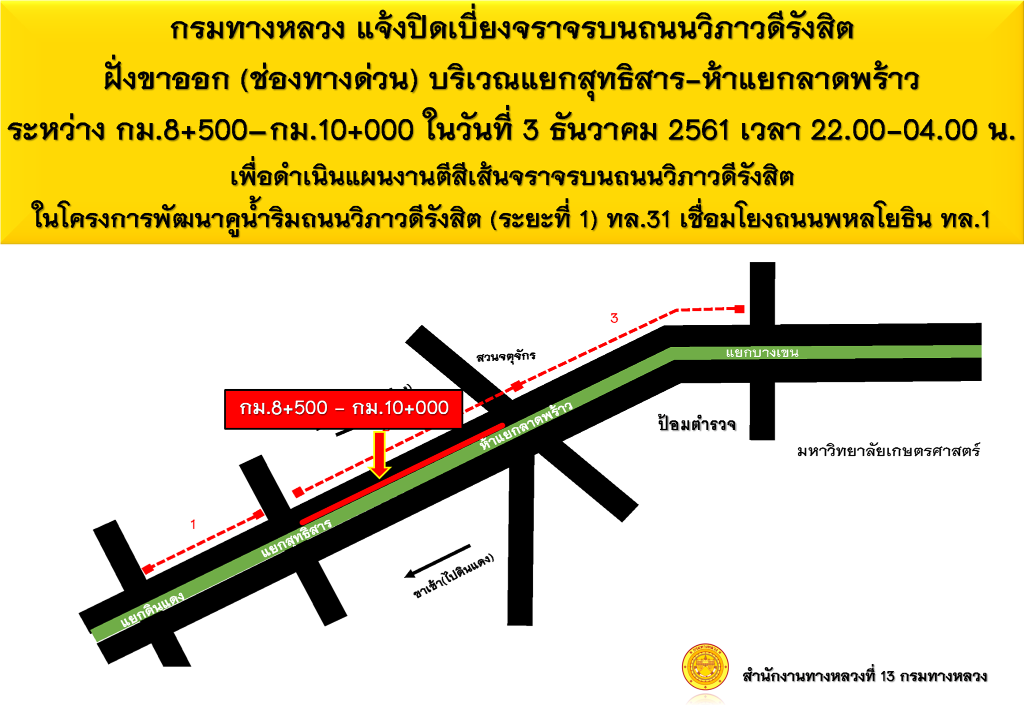 กรมทางหลวง โดย สำนักงานทางหลวงที่ 13 แจ้งปิดการจราจรบนถนนวิภาวดีรังสิต (ช่องทางด่วนขาออก) บริเวณห้าแยกลาดพร้าว ระหว่าง กม.11+200 - กม.12+000 เลนที่ 2 (เลนกลาง) ในวันที่ 4 ธันวาคม 2561 เวลา 22.00 - 04.00 น. เพื่อดำเนินงานปรับปรุงผิวจราจรโดยการลาดยาง จึงมีความจำเป็นต้องปิดการจราจรชั่วคราวในจุดดังกล่าว โดยใช้ทางคู่ขนานแทน ระหว่างดำเนินการอาจทำให้การจราจรติดขัด ไม่สะดวกแก่ผู้ใช้รถใช้ถนนและประชาชนทั่วไป กรมทางหลวงต้องขออภัยมา ณ โอกาสนี้
