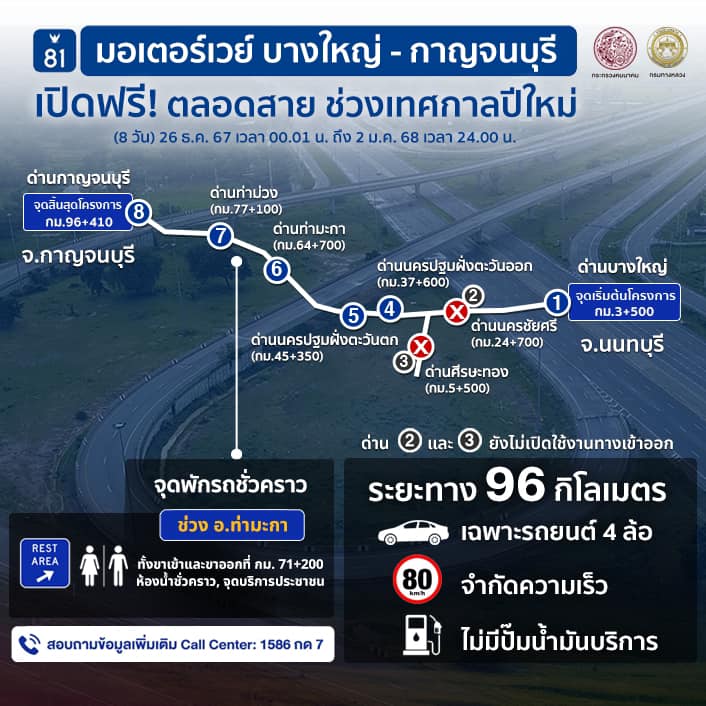 กรมทางหลวงเปิดทดลอง มอเตอร์เวย์ M81 ตลอดสาย จากบางใหญ่-กาญจนบุรี ตั้งแต่ เวลา 00.01 น. ของวันที่ 26 ธ.ค. 67 ถึง เวลา 24.00 น. ของวันที่ 2 ม.ค. 68