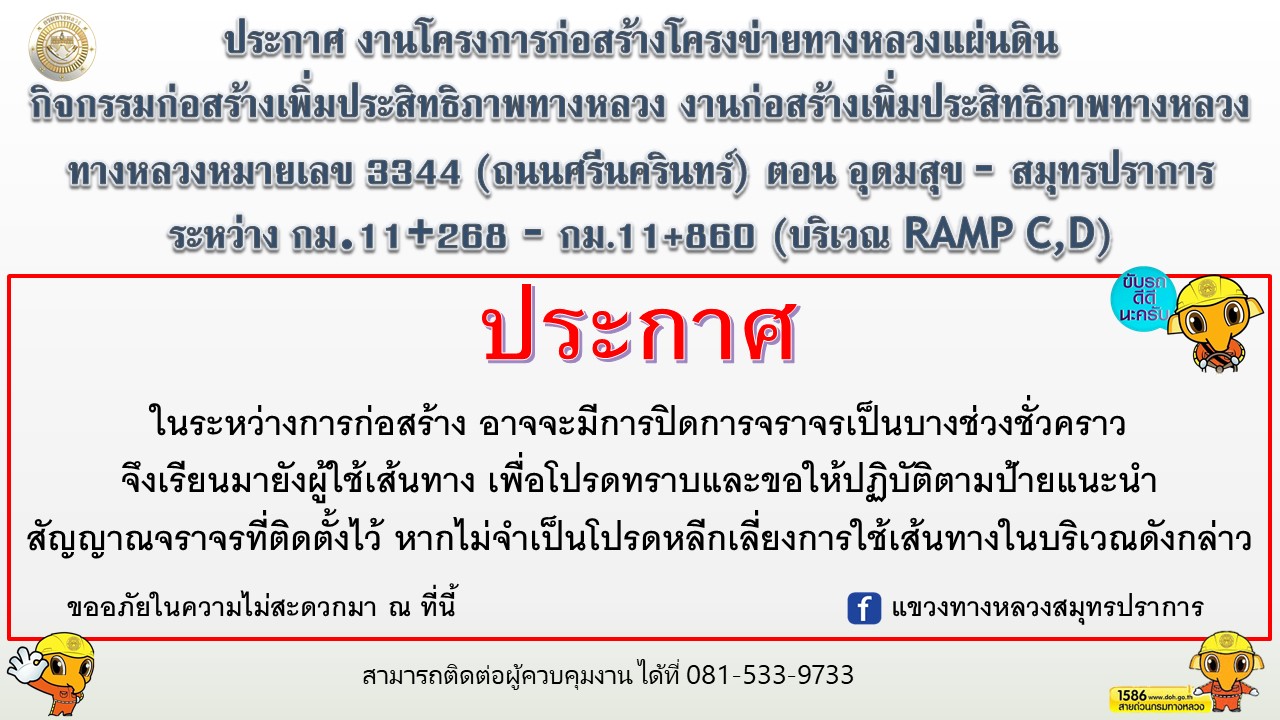 งานโครงการก่อสร้างโครงข่ายทางหลวงแผ่นดิน กิจกรรมก่อสร้างเพิ่มประสิทธิภาพทางหลวง งานก่อสร้างเพิ่มประสิทธิภาพทางหลวง ทางหลวงหมายเลข 3344 (ถนนศรีนครินทร์) ตอน อุดมสุข - สมุทรปราการ ระหว่าง กม.11+268 - กม.11+860 (บริเวณ RAMP C,D)