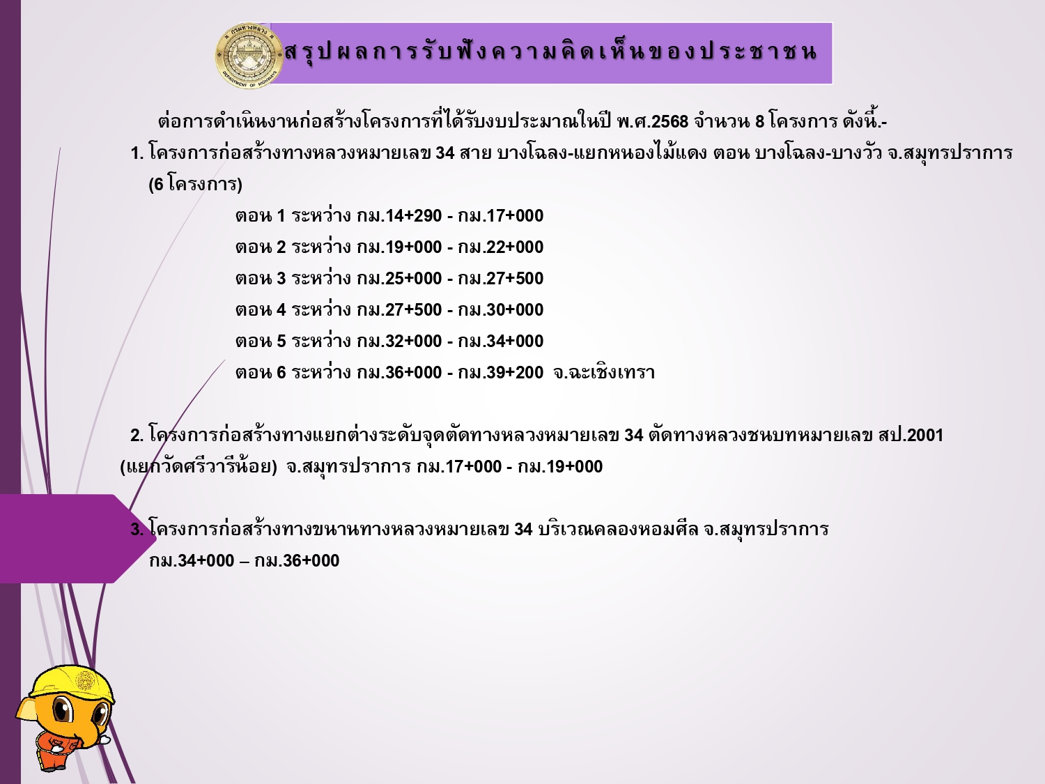 ตามที่ แขวงทางหลวงสมุทรปราการ ได้จัดกิจกรรมการมีส่วนร่วมของประชาชน สำหรับโครงการก่อสร้างทางหลวง ตามแผนงบประมาณประจำปี พ.ศ. 2568 รวมทั้งสิ้น 8 โครงการ ประกอบด้วย