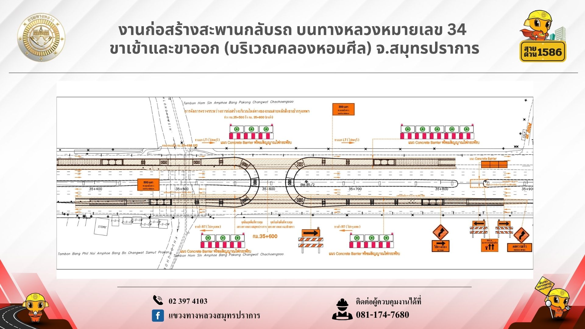 สอบถามข้อมูลเพิ่มเติม ผู้ควบคุมงาน: 081-174-7680, แขวงทางหลวงสมุทรปราการ: 02-397-4103, สายด่วนกรมทางหลวง 1586 (โทรฟรีทุกเครือข่าย)