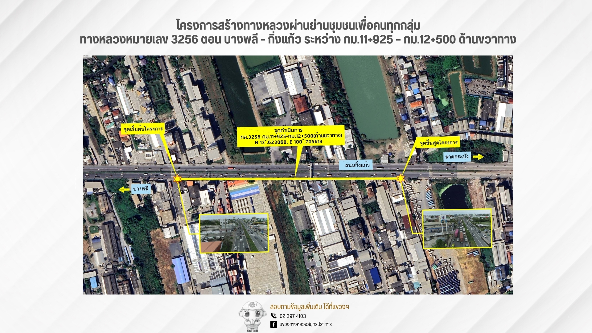 เชิญร่วมแสดงความคิดเห็น!!! แขวงทางหลวงสมุทรปราการขอเชิญประชาชนเข้าร่วม กิจกรรมการมีส่วนร่วมของประชาชน ตามที่ได้รับการจัดสรรงบประมาณดำเนินการก่อสร้างก่อสร้างทางหลวงผ่านย่านชุมชนเพื่อคนทุกกลุ่ม ทางหลวงหมายเลข 3256 ตอน บางพลี - กิ่งแก้ว ระหว่าง กม.11+925 – กม.12+500 (ด้านขวาทาง)
