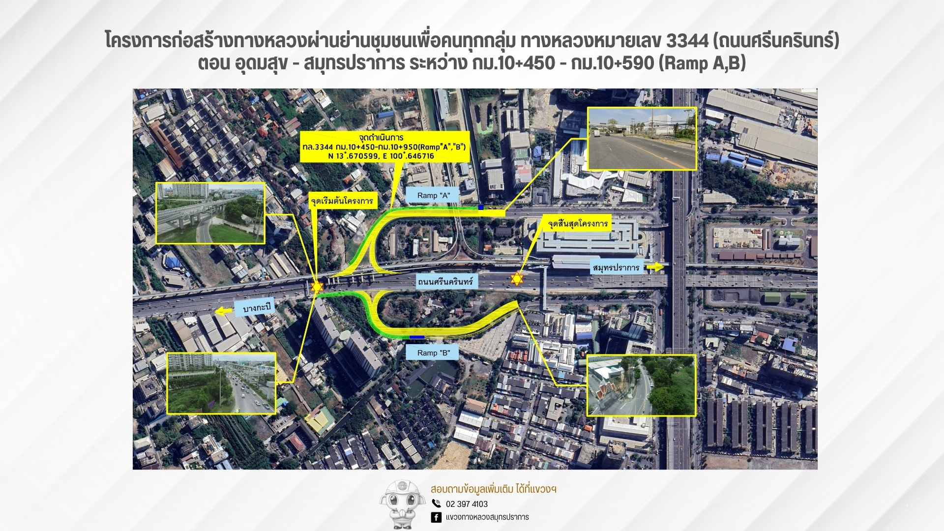 เชิญร่วมแสดงความคิดเห็น!!! ขอเชิญประชาชนเข้าร่วม กิจกรรมการมีส่วนร่วมของประชาชนด้วยแขวงทางหลวงสมุทรปราการ (กรมทางหลวง) ได้รับการจัดสรรงบประมาณดำเนินการก่อสร้างโครงการก่อสร้างทางหลวงผ่านย่านชุมชนเพื่อคนทุกกลุ่ม ทางหลวงหมายเลข 3344 (ถนนศรีนครินทร์) ตอน อุดมสุข - สมุทรปราการ ระหว่าง กม.10+450 - กม.10+590 (Ramp A,B)