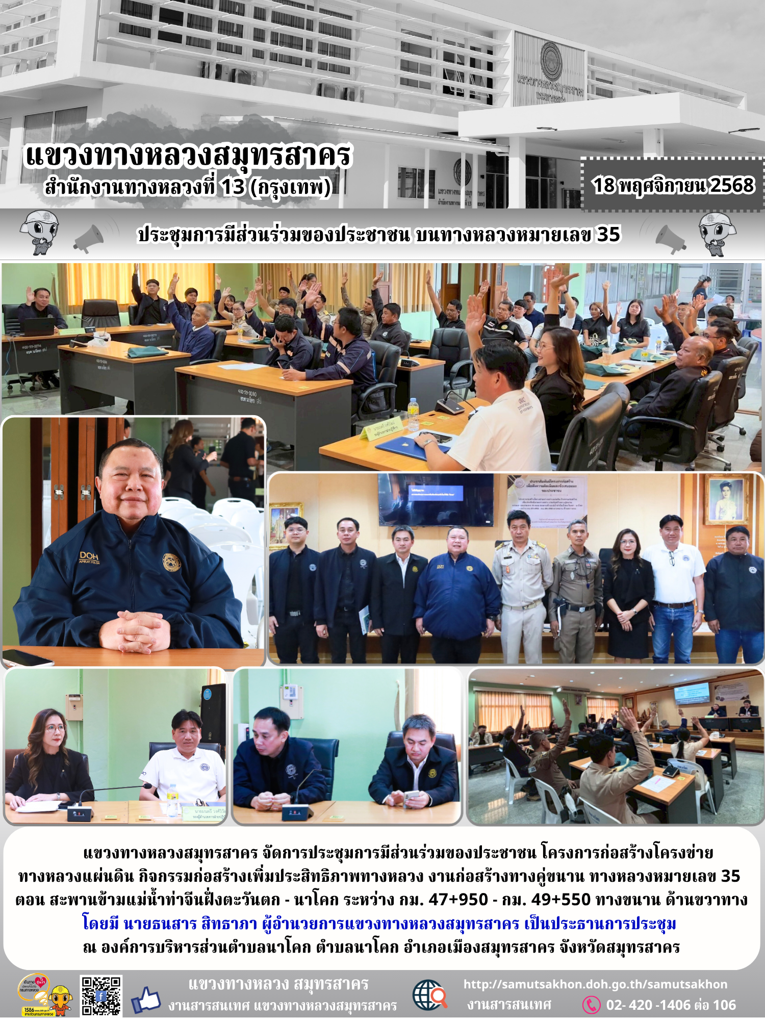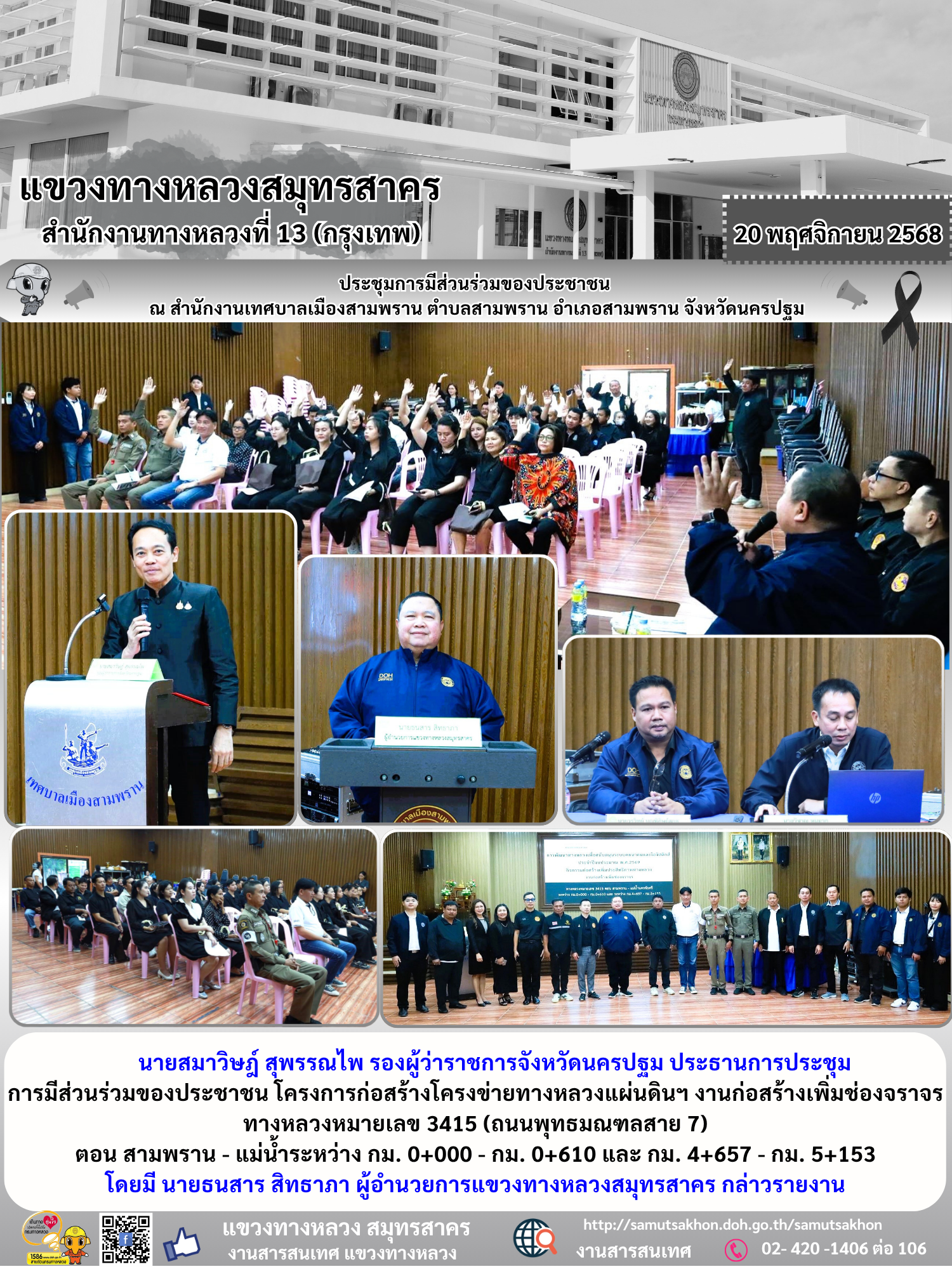 แขวงทางหลวงสมุทรสาคร จัดการประชุมการมีส่วนร่วมของประชาชน โครงการก่อสร้างโครงข่ายทางหลวงแผ่นดิน กิจกรรมก่อสร้างเพิ่มประสิทธิภาพทางหลวง งานก่อสร้างเพิ่มช่องจราจร บนทางหลวงหมายเลข 3415 (ถนนพุทธมณฑลสาย 7)