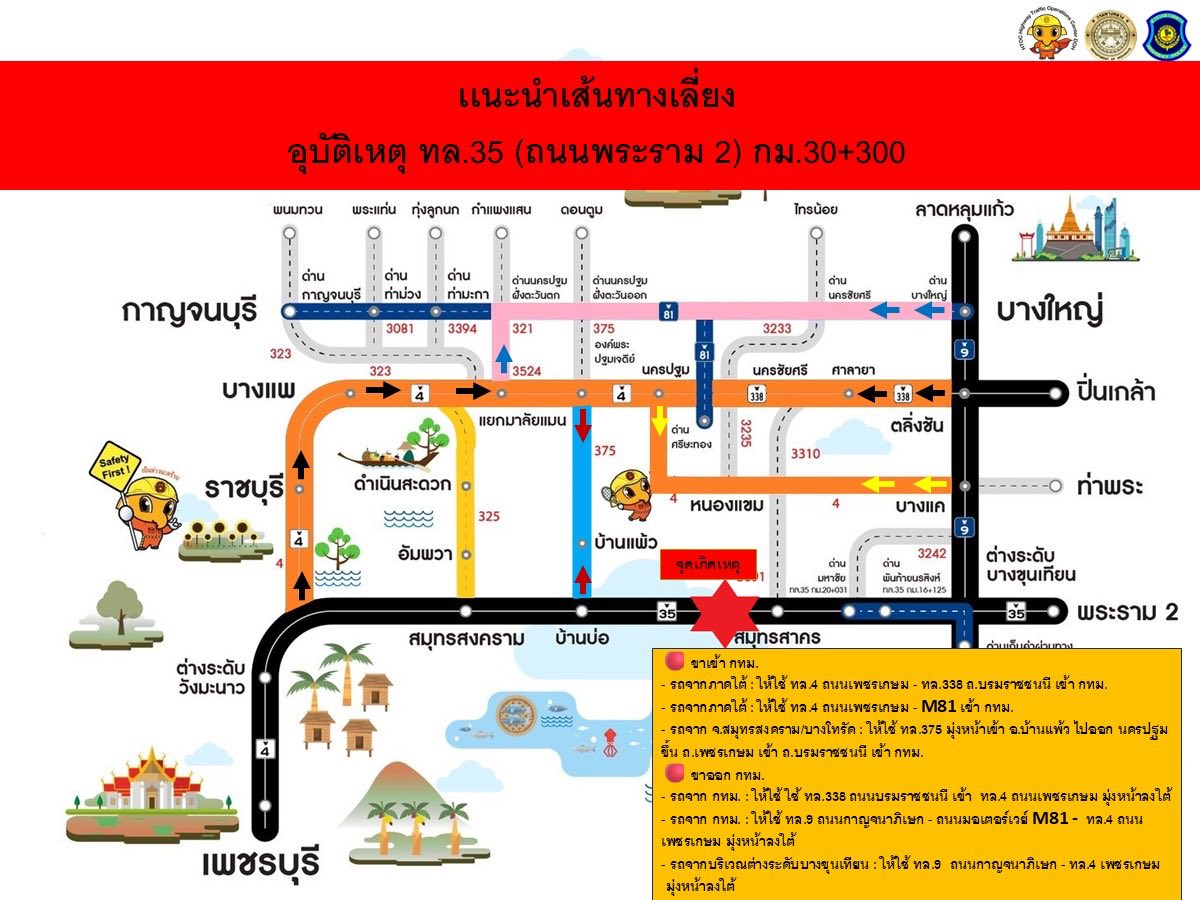 ปิดทางเบี่ยงการจราจรบนถนนพระราม 2 ที่ กม. 30+500 เพื่อเร่งระบายรถจากเหตุโครงสร้างเหล็กจากโครงการก่อสร้างทางหลวงพิเศษหมายเลข 82 ตอน 7 (M82) ร่วงหล่นบนถนนพระราม 2