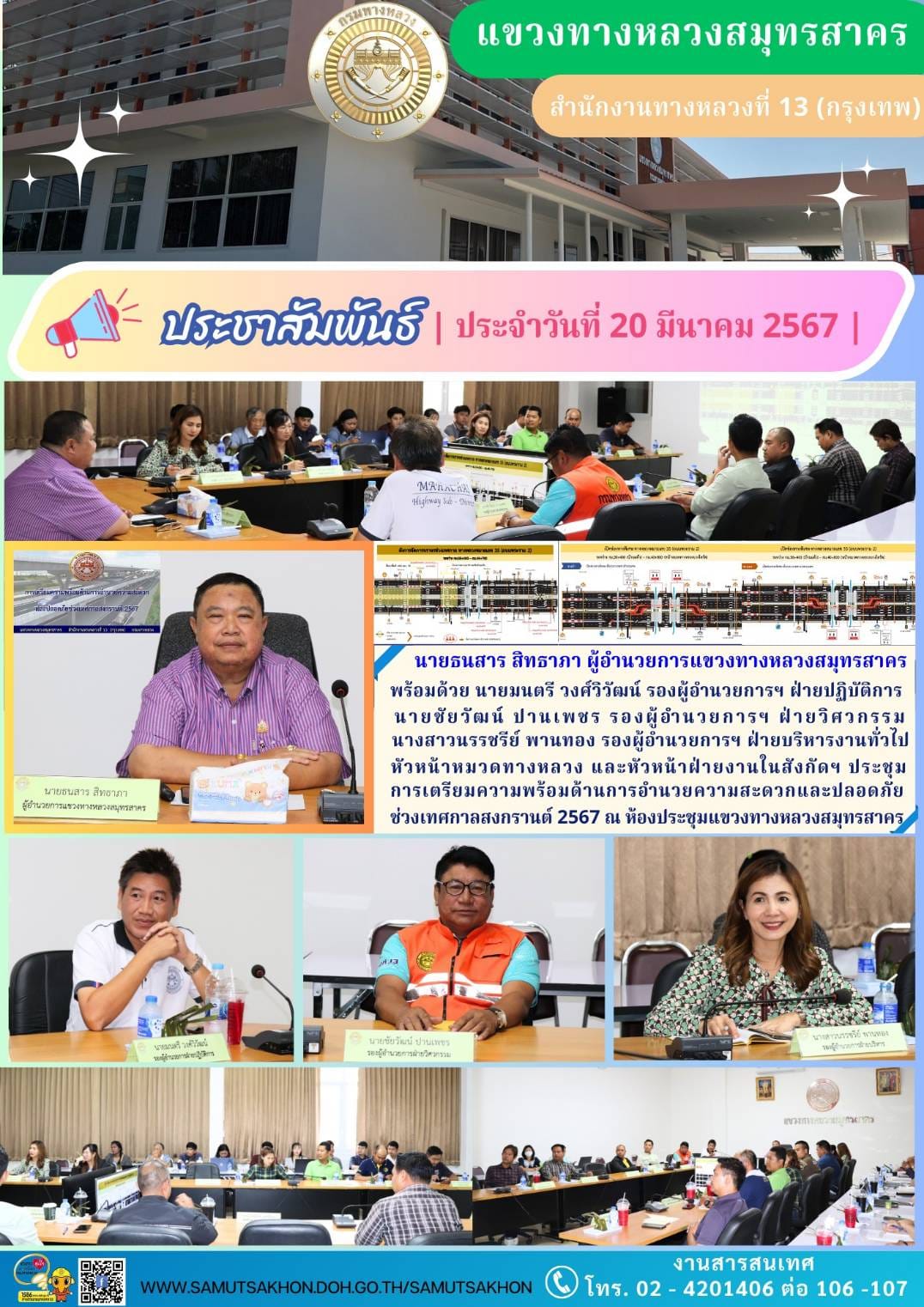 นที่ 20 มีนาคม 2567 นายธนสาร สิทธาภา ผู้อำนวยการแขวงทางหลวงสมุทรสาคร ประธานการประชุมแผนจัดการจราจรเตรียมความพร้อมรองรับการเดินทางของประชาชนช่วงเทศกาลสงกรานต์ 2567 โดยมี นายมนตรี วงศ์วิวัฒน์ รองผู้อำนวยการแขวงฯ ฝ่ายปฏิบัติการ นายชัยวัฒน์ ปานเพชร รองผู้อำนวยการแขวงฯ ฝ่ายวิศวกรรม และนางสาวนรรชรีย์ พานทอง รองผู้อำนวยการแขวงฯ ฝ่ายบริหารงานทั่วไป หัวหน้าหมวด/งานในสังกัด ผู้แทนโครงการก่อสร้างฯ และผู้แทนตำรวจทางหลวงเข้าร่วม ณ ห้องประชุมสำนักงานแขวงทางหลวงสมุทรสาคร