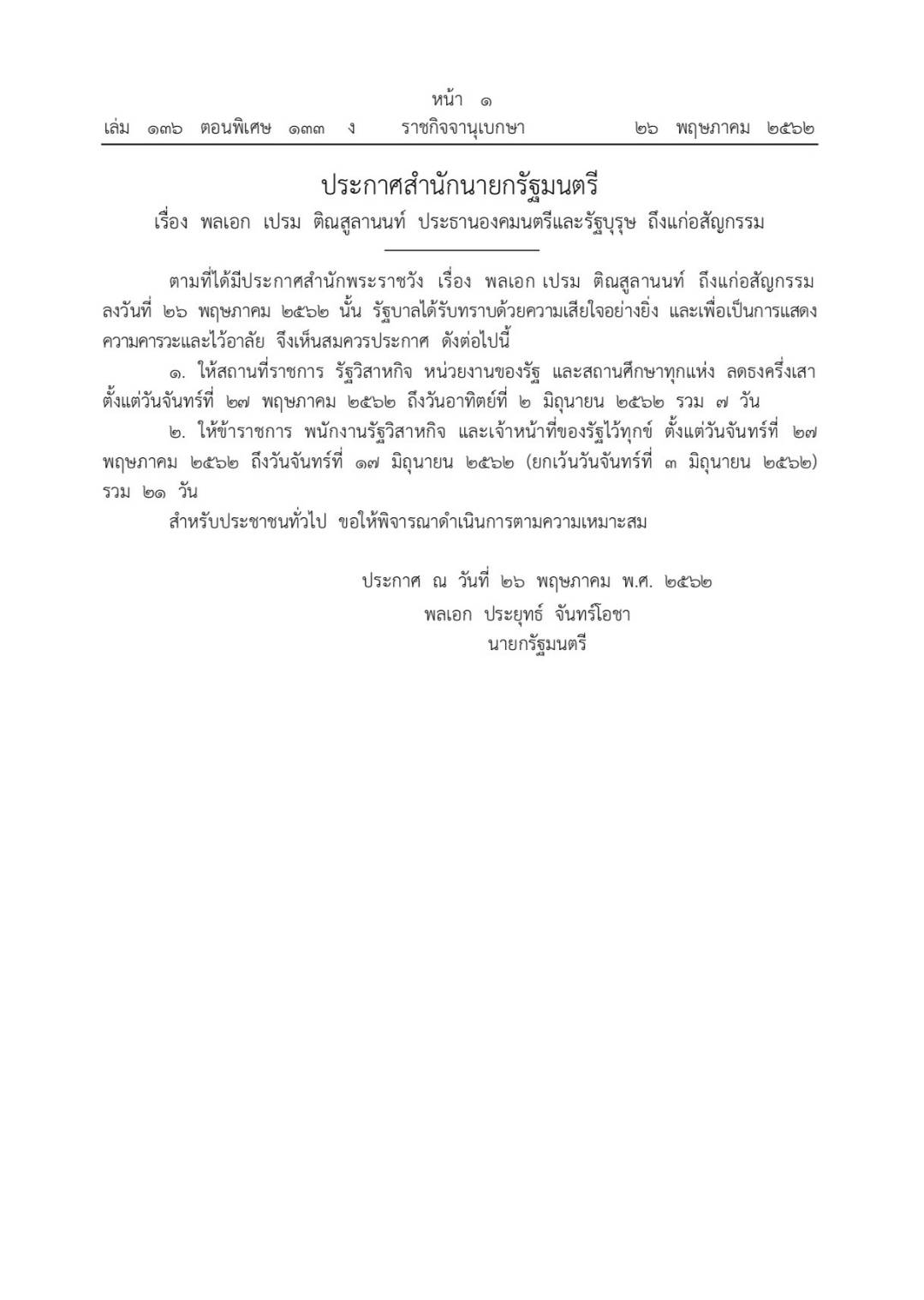 10 27/05/2562 ประกาศสำนักนายกรัฐมนตรี เรื่อง พลเอก เปรม ติณสูลานนท์ ถึงแก่อสัญกรรม
